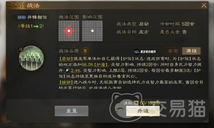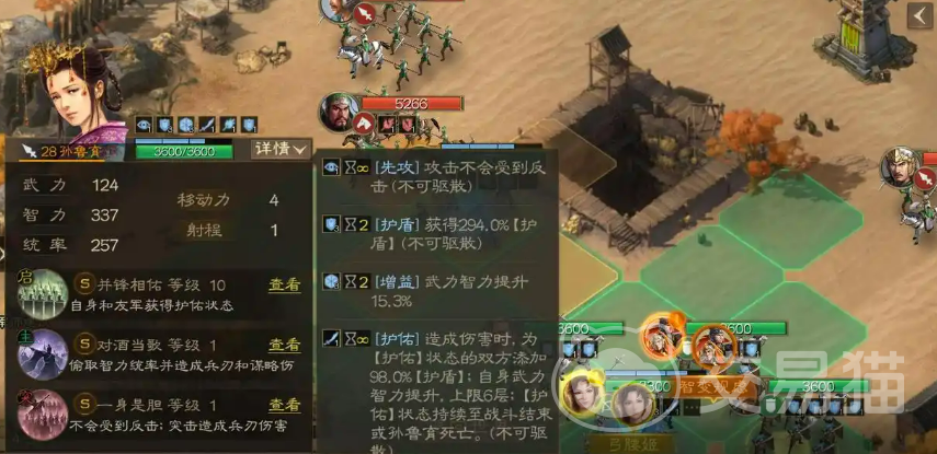 【并锋相佑】的效果是这样的:启动时,孙鲁育和选择的友军会获得一个叫做“护佑”的状态。这意味着,攻击敌人时,孙鲁育和被牵手的友军都会得到98%的护盾加成,持续两回合,并且每次触发都能提升武力和智力,最多能叠加六层。这些加成不仅仅是护盾,武力智力的提升也是十分可观的,尤其是当你能够保证每回合都能最大化触发护佑效果时,简直就是让牵手的英雄变得无敌了。