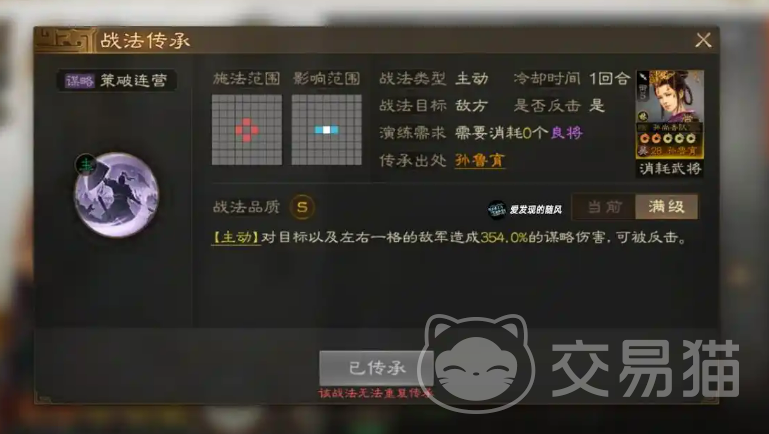 对于传承战法的部分,孙鲁育带来的【策破连营】也有不小的看点。虽然它是一个1CD的近战谋略伤害战法,伤害的倍率非常高,能够对敌方造成354%的谋略伤害,但是它的应用条件也有点限制——要让敌人排成一排才好发挥威力。不过,这个技能在对付密集站位的敌人时,简直是如鱼得水,值得你好好利用。